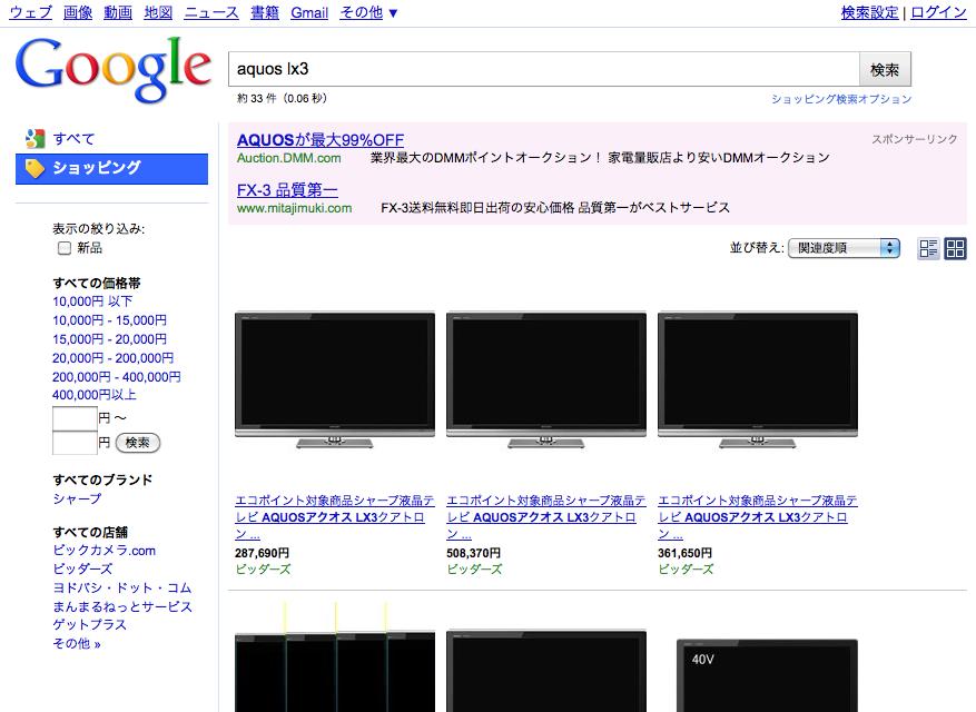 HOME > ニュース > AV&ホームシアターニュース 店舗は無料で登録可能 グーグル、価格比較サービス「Google ショッピング」日本語版を公開 ファイル・ウェブ編集部 2010年10月28日 前の写真へ 検索結果はタイル形式で表示することも可能 前の写真へ この写真の記事へ 関連リンク Google ショッピング