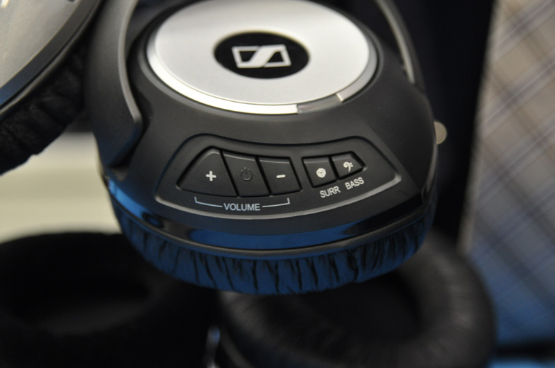 RS170のイヤーカップ。サラウンド機能、低域のエンハンス機能の設定ボタンを備える