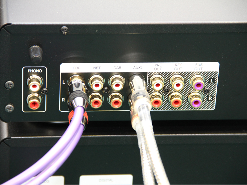 「EXEO-AMP」の入出力。プリアウトやサブウーファー出力端子、Phono入力などを装備