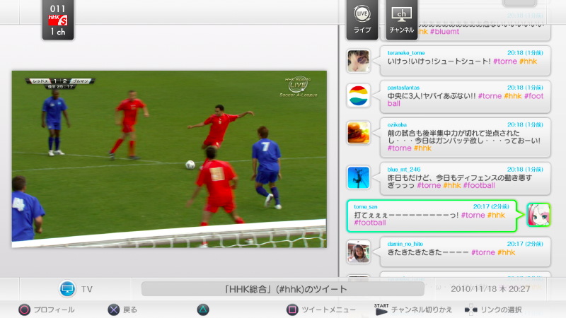 HOME > ニュース > AV&ホームシアターニュース 「新しいテレビ視聴体験を」 SCE、torneにTwitter連携機能を追加 − 「バージョン 2.10“ライブ”」を今冬提供 ファイル・ウェブ編集部 2010年11月18日 次の写真へ 番組に関連したツイートをテレビ画面と同時に見る事ができる 次の写真へ この写真の記事へ 関連リンク torneの詳細 ソニー・コンピュータエンタテインメント