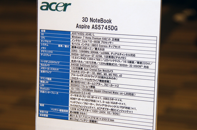 日本エイサー、実売99,800円の3D対応15.6インチノートPC「AS5745DG-A54E/L」を発売