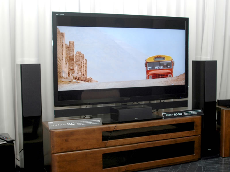 「55X2」。テレビラックは朝日木材加工のADKブランドによる製品