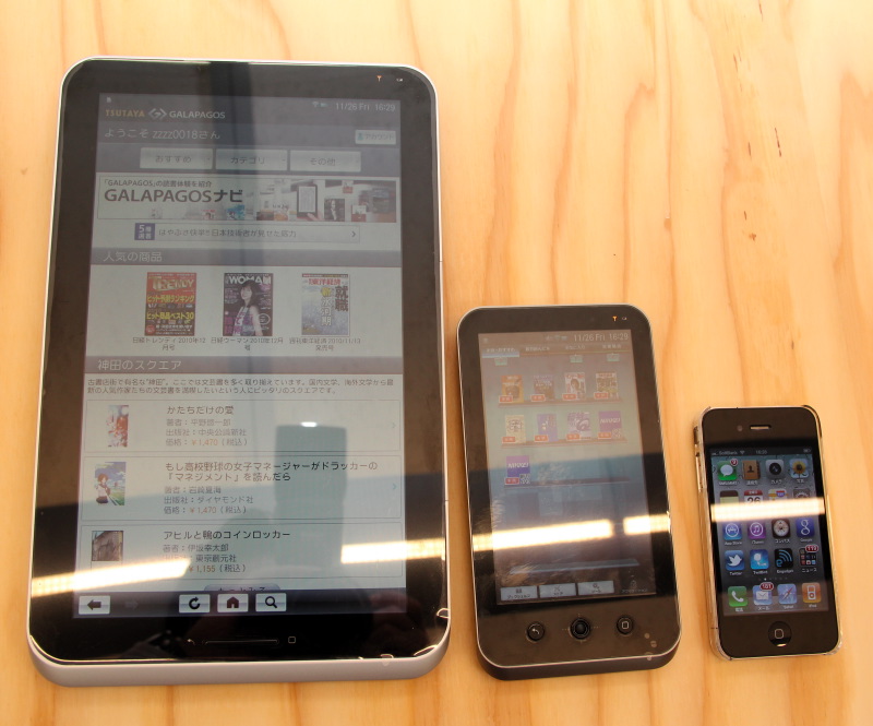 HOME > ニュース > AV&ホームシアターニュース 「TSUTAYA GALAPAGOS」の詳細も明らかに シャープ、タブレット「GALAPAGOS」を12月10日発売 − 直販のみで5.5型は39,800円、10.8型は54,800円 ファイル・ウェブ編集部 2010年11月29日 次の写真へ 左から10.8型モデル、5.5型モデル、参考用のiPhone 4 次の写真へ この写真の記事へ 関連リンク シャープ GALAPAGOS 特設サイト