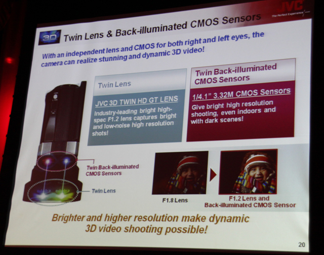 HOME > ニュース > AV&ホームシアターニュース 最新の高性能プロセッサー「FALCONBRID」を搭載 【CES】JVCから登場 − フルHD 3D動画撮影対応のビデオカメラ「GS-TD1」を会田肇が速攻チェック 会田 肇 2011年01月07日 前の写真へ 次の写真へ プレスカンファレンスの資料。ツインレンズと裏面照射型CMOSセンサーのシステム図。右下はF1.2レンズを採用したこのメリットを解説 前の写真へ 次の写真へ この写真の記事へ 関連リンク 2011 International CES 日本語公式サイト 2011 International CESレポート一覧 ビクター・JVC