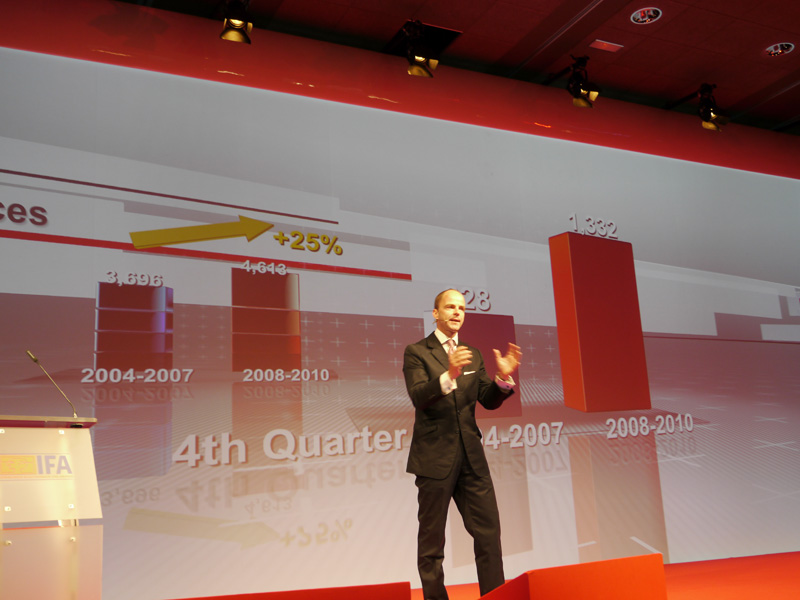 HOME > ニュース > AV&ホームシアターニュース スペイン開催:IFA2011グローバル・プレスカンファレンス IFA2011は展示ホールを増設して開催へ − メッセ・ベルリン社ゲーケ氏が語る“今年のIFAのハイライト” ファイル・ウェブ編集部 2011年04月18日 前の写真へ 次の写真へ IFAに参加するホームアプライアンスメーカーの製品サイクルが活発化しているという 前の写真へ 次の写真へ この写真の記事へ 関連リンク IFA2011日本語サイト IFA2011公式サイト