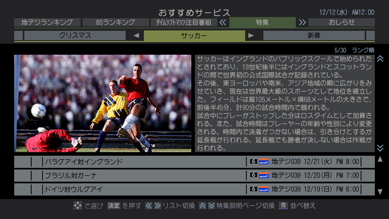 おすすめ番組の「特集」表示画面