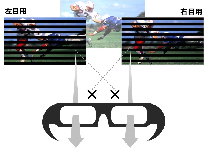 パッシブ型3Dの表示イメージ。垂直解像度は半分に落ちる
