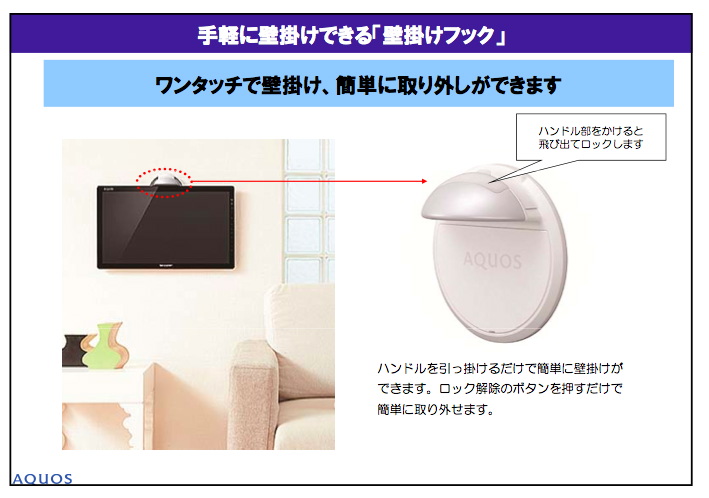 HOME > ニュース > AV&ホームシアターニュース チューナーとディスプレイ分離型 シャープ、バッテリー内蔵ディスプレイ採用の“フリースタイルAQUOS”を発売 ファイル・ウェブ編集部 2011年04月21日 前の写真へ 次の写真へ 別売りの壁掛けフック。カラーはホワイトのみ 前の写真へ 次の写真へ この写真の記事へ 関連リンク フリースタイルAQUOSの詳細 AQUOSホームページ