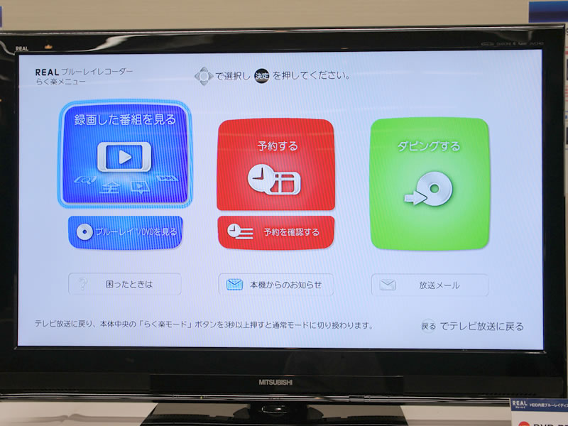 「らく楽モード」のトップ画面。アイコンの色がリモコンのボタンのものと連動している