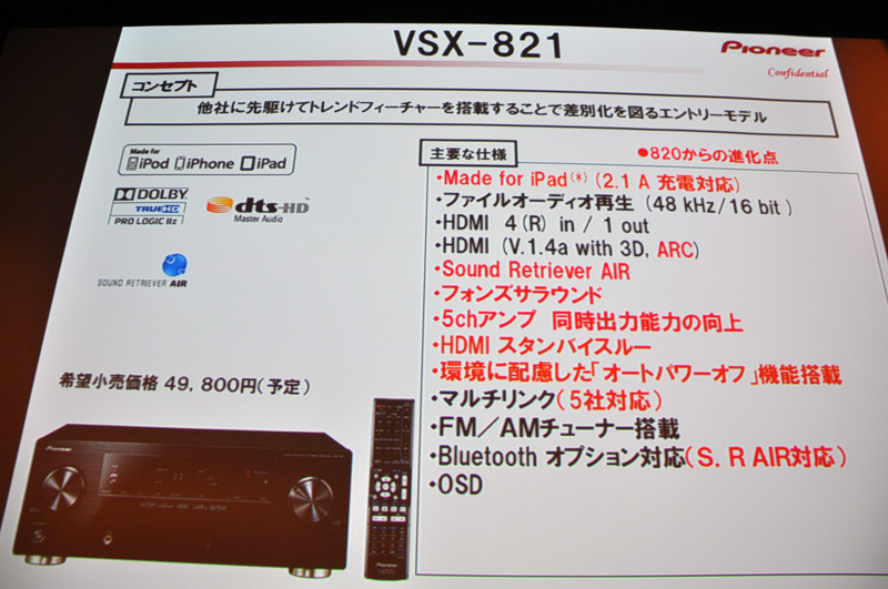 HOME > ニュース > AV&ホームシアターニュース どこよりも早いクオリティチェック付き 【レビュー有】パイオニア、AirPlay/ネットオーディオ/iOSアプリ操作対応のAVアンプ「VSA-1021」など3機種を発売 ファイル・ウェブ編集部 2011年04月26日 前の写真へ 次の写真へ VSX-821のフィーチャー 前の写真へ 次の写真へ この写真の記事へ 関連リンク パイオニア AVアンプ製品情報ページ パイオニアの製品レビュー満載「パイオニア・エンサイクロペディア」
