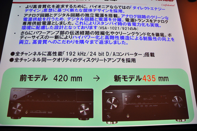 HOME > ニュース > AV&ホームシアターニュース どこよりも早いクオリティチェック付き 【レビュー有】パイオニア、AirPlay/ネットオーディオ/iOSアプリ操作対応のAVアンプ「VSA-1021」など3機種を発売 ファイル・ウェブ編集部 2011年04月26日 前の写真へ 次の写真へ 筐体は外観も内部もデザインが変更された 前の写真へ 次の写真へ この写真の記事へ 関連リンク パイオニア AVアンプ製品情報ページ パイオニアの製品レビュー満載「パイオニア・エンサイクロペディア」