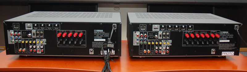 RX-V471(左)とRX-V571(右)の背面端子部。HDMI端子とスピーカーターミナルの数が異なる