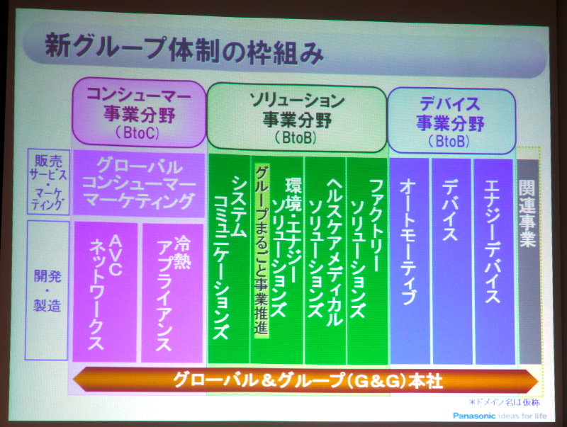 HOME > ニュース > AV&ホームシアターニュース 2011年度の事業方針は「攻める」「変わる」 パナソニック、パネルのサイズ別棲み分け戦略を撤廃 − 液晶テレビを中型サイズで積極展開 ファイル・ウェブ編集部 2011年04月28日 前の写真へ 次の写真へ 新グループ体制では3つの事業分野に9つの事業ドメインがぶらさがる構造となる 前の写真へ 次の写真へ この写真の記事へ 関連リンク パナソニック パナソニックの2010年度業績概要 パナソニックの2011年度事業方針