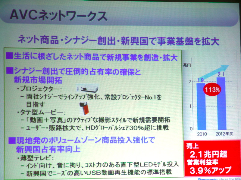 HOME > ニュース > AV&ホームシアターニュース 2011年度の事業方針は「攻める」「変わる」 パナソニック、パネルのサイズ別棲み分け戦略を撤廃 − 液晶テレビを中型サイズで積極展開 ファイル・ウェブ編集部 2011年04月28日 前の写真へ 次の写真へ AVCネットワークスでは三洋の資産を活かしながら事業基盤の拡大を狙う 前の写真へ 次の写真へ この写真の記事へ 関連リンク パナソニック パナソニックの2010年度業績概要 パナソニックの2011年度事業方針