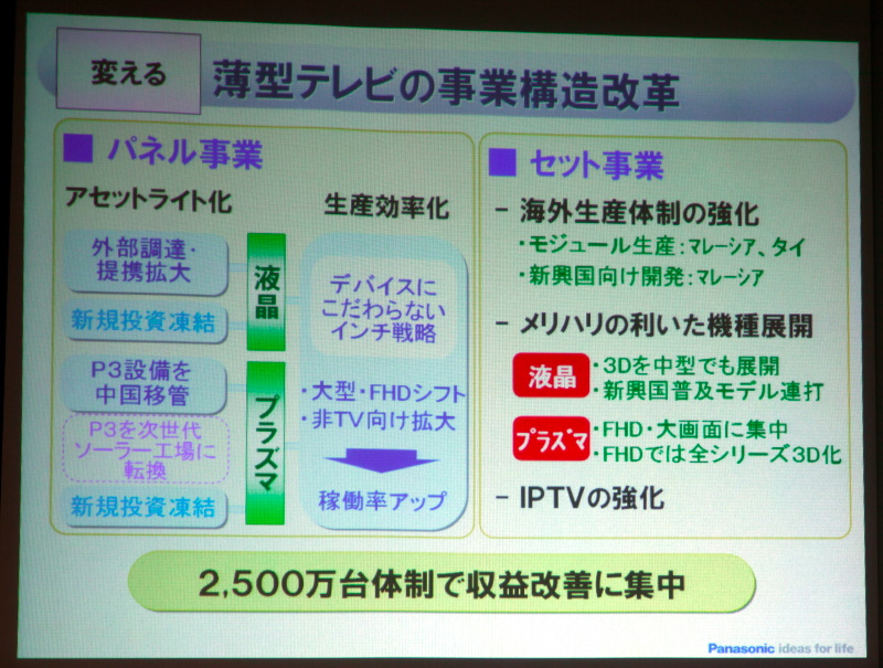 HOME > ニュース > AV&ホームシアターニュース 2011年度の事業方針は「攻める」「変わる」 パナソニック、パネルのサイズ別棲み分け戦略を撤廃 − 液晶テレビを中型サイズで積極展開 ファイル・ウェブ編集部 2011年04月28日 前の写真へ 薄型テレビの事業構造改革の概要 前の写真へ この写真の記事へ 関連リンク パナソニック パナソニックの2010年度業績概要 パナソニックの2011年度事業方針