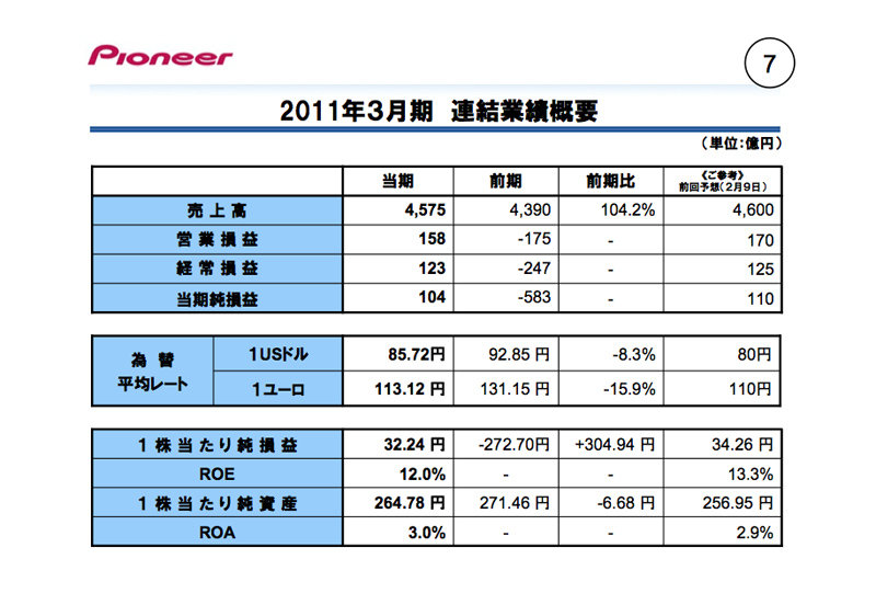HOME > ニュース > AV&ホームシアターニュース BDドライブ関連製品やAVレシーバーが好調 パイオニア、2010年度業績を発表 − 純利益は7期ぶりの黒字転換 ファイル・ウェブ編集部 2011年05月11日 次の写真へ 2010年度通期の連結業績 次の写真へ この写真の記事へ 関連リンク パイオニアのIR情報