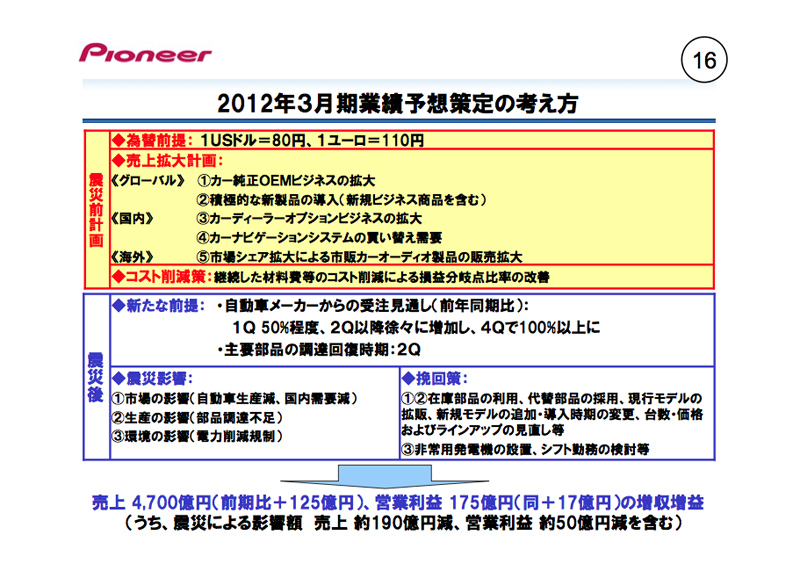 HOME > ニュース > AV&ホームシアターニュース BDドライブ関連製品やAVレシーバーが好調 パイオニア、2010年度業績を発表 − 純利益は7期ぶりの黒字転換 ファイル・ウェブ編集部 2011年05月11日 前の写真へ 2012年3月期業績予想策定の考え方 前の写真へ この写真の記事へ 関連リンク パイオニアのIR情報