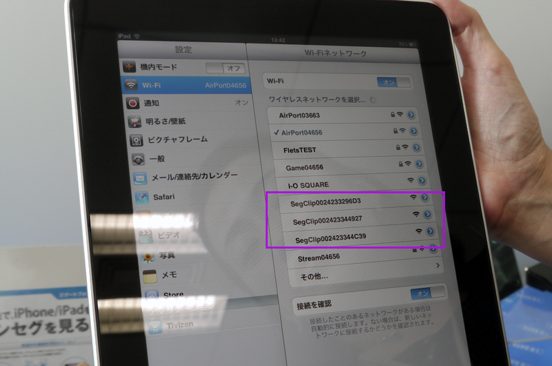 設定>Wi-Fiをオンにして、SEG CLIPを選択して接続(四角で囲った部分)
