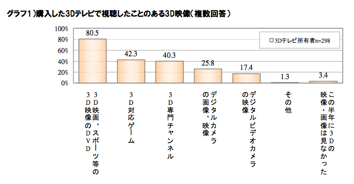 HOME > ニュース > AV&ホームシアターニュース 所有者の半数が3D映像視聴頻度「週1回以下」 3Dテレビ所有者の4人に3人は3D視聴に「不満あり」 − GfKが調査 ファイル・ウェブ編集部 2011年06月01日 前の写真へ 購入した3Dテレビで視聴した3Dコンテンツは、映画やスポーツなどのDVDがトップ 前の写真へ この写真の記事へ 関連リンク 本件の詳細(PDF)