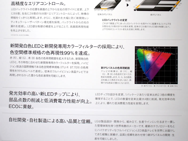 新開発の白色LEDとカラーフィルターによりハイビジョン放送規格色再現性99パーセントを達成
