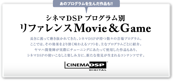 HOME > ニュース > AV&ホームシアターニュース 各モード開発時のチューニングに使用された作品も ヤマハ、「シネマDSP」プログラム別のリファレンス映画/ゲームなどを紹介 − シネマDSP25周年特設サイトにて ファイル・ウェブ編集部 2011年06月15日 この写真の記事へ 関連リンク シネマDSPプログラム別 リファレンスMovie&Game 「シネマDSP」25周年特設サイト ヤマハのAVアンプが実現する賢い“スマート消費”の秘密