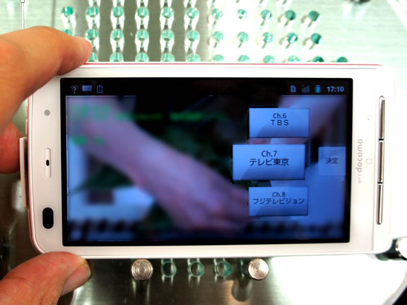 ワンセグのチャンネル選択画面。こちらも最初のロック解除方法によってメニューが右側に表示されるか左側に表示されるかが変わる。これにより片手でワンセグ操作を行えるようにした