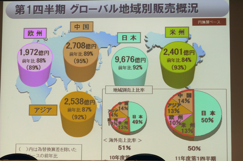HOME > ニュース > AV&ホームシアターニュース 三洋の白物家電事業の一部をハイアールに譲渡 パナソニック、2011年度1Q決算を発表 − 売上高は前年同期比11%減 ファイル・ウェブ編集部 2011年07月28日 前の写真へ グローバル地域別の販売概況 前の写真へ この写真の記事へ 関連リンク パナソニックの決算発表