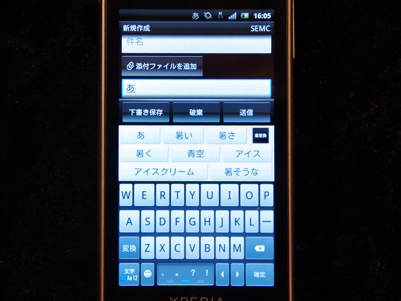 文字入力画面。予測変換候補の表示スペースを下方向にフリックすると…