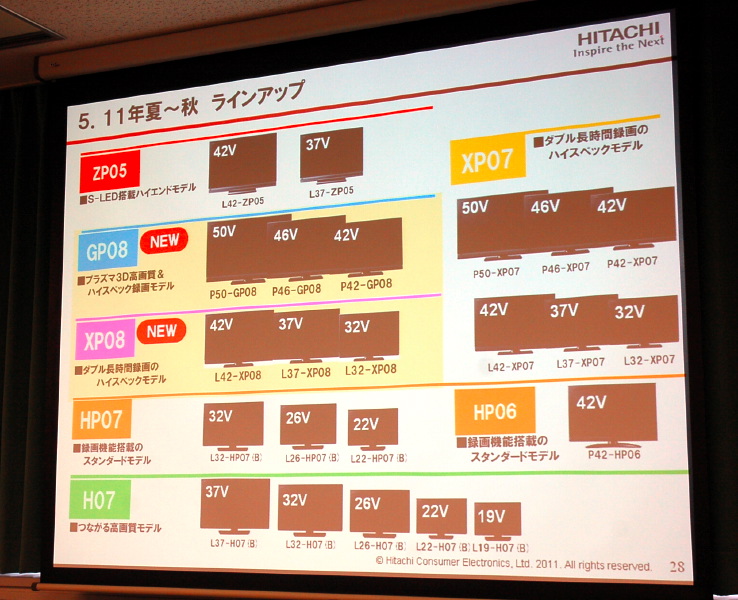 HOME > ニュース > AV&ホームシアターニュース 充実の録画機能も継承 日立、3D対応でiPhone/iPad操作も可能なプラズマ“Wooo”GP08シリーズ ファイル・ウェブ編集部 2011年08月11日 前の写真へ 次の写真へ Woooの2011年夏〜秋ラインナップ 前の写真へ 次の写真へ この写真の記事へ 関連リンク 日立Wooo製品情報ページ Phile-web「Wooo WoRLD」 日立コンシューマエレクトロニクス