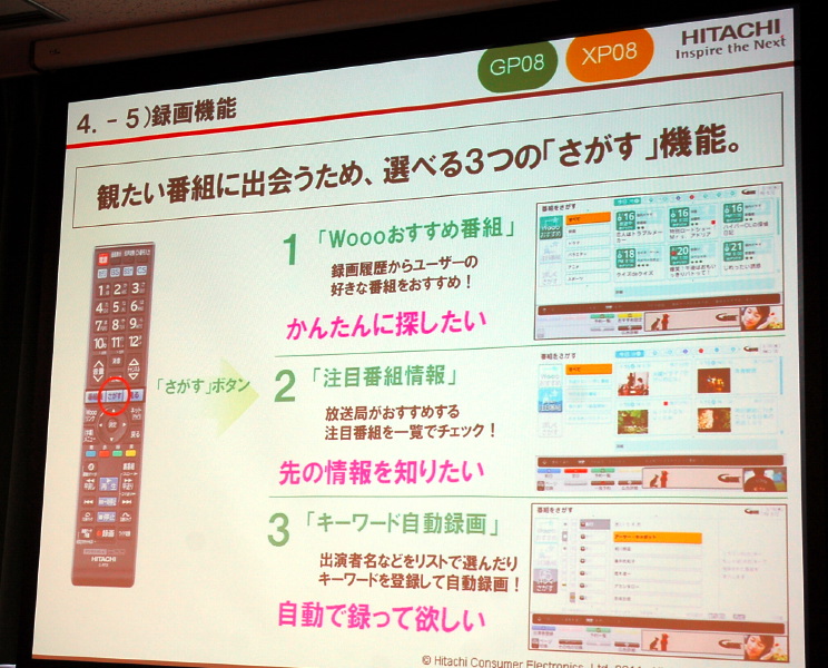 HOME > ニュース > AV&ホームシアターニュース スマホ連携で操作性向上 日立、iPhone/iPad対応で節電性能も高めた液晶“Wooo”XP08シリーズ ファイル・ウェブ編集部 2011年08月11日 前の写真へ 録画した番組を表示・検索する機能は非常に充実している 前の写真へ この写真の記事へ 関連リンク 日立Wooo製品情報ページ Phile-web「Wooo WoRLD」 日立コンシューマエレクトロニクス