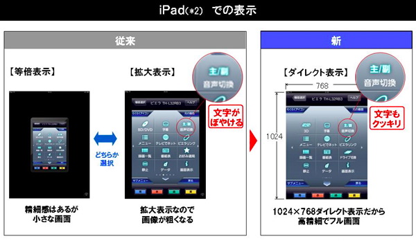 HOME > ニュース > AV&ホームシアターニュース XGA画面で操作可能に パナソニックのiOSアプリ「Viera remote」がiPadにネイティブ対応 ファイル・ウェブ編集部 2011年08月30日 新旧アプリの見え方の違い この写真の記事へ 関連リンク 本件のニュースリリース パナソニック