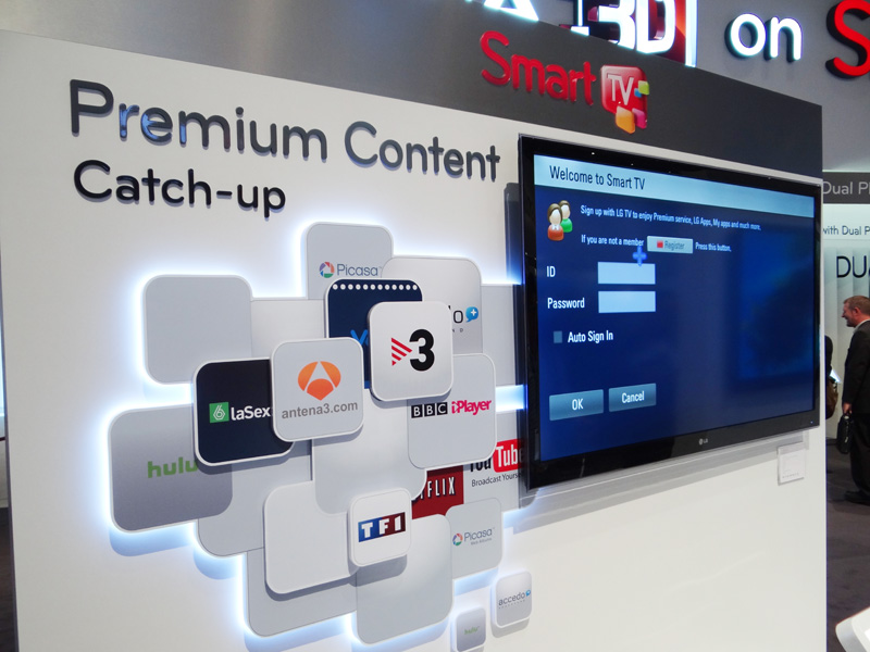HOME > ニュース > AV&ホームシアターニュース フラグシップLED液晶「LW980S」も登場 <IFA>LGブースは「ゼンブ3D」 − 「Smart TV」のクラウド型サービスにもハイライト ファイル・ウェブ編集部:山本 敦 2011年09月04日 前の写真へ 次の写真へ クラウドを模した「Smart TV」のパネルとデモコーナー 前の写真へ 次の写真へ この写真の記事へ 関連リンク LGエレクトロニクス IFA2011日本語サイト