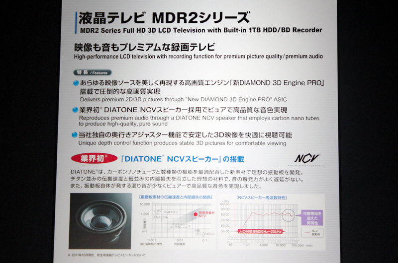 HOME > ニュース > AV&ホームシアターニュース 既発売のレーザー採用リアプロも登場 <CEATEC>三菱ブースは「レーザーバックライト液晶テレビ」&「PJ用レーザー光源」に注目集まる ファイル・ウェブ編集部 2011年10月04日 前の写真へ 次の写真へ 「MDR2シリーズ」の詳細。NCVスピーカーを10個も搭載している 前の写真へ 次の写真へ この写真の記事へ 関連リンク CEATEC JAPAN 2011 CEATEC JAPAN 2011ニュース一覧 三菱電機(株)