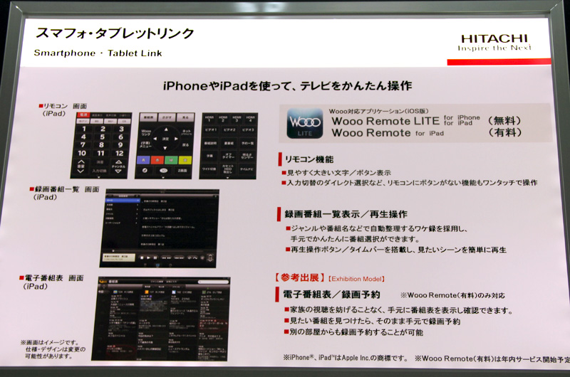 HOME > ニュース > AV&ホームシアターニュース S-LEDモデル最新機「L46-S08」なども訴求 <CEATEC>日立、DLNA対応iVDRレコーダーや1TB iVDRなど参考出展 ファイル・ウェブ編集部 2011年10月04日 前の写真へ 次の写真へ Wooo Remoteの詳細 前の写真へ 次の写真へ この写真の記事へ 関連リンク CEATEC JAPAN 2011ニュース一覧 CEATEC JAPAN 2011 日立製作所