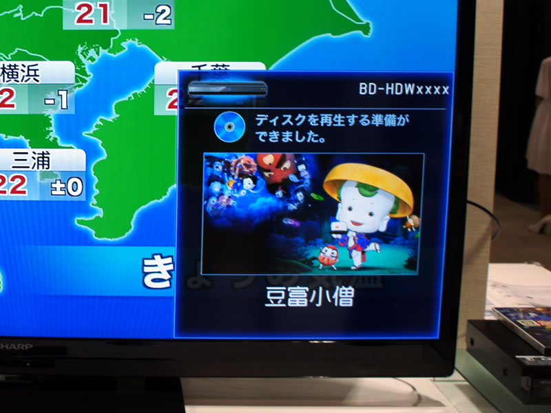 HOME > ニュース > AV&ホームシアターニュース ガラパゴスなどの展示も <CEATEC>シャープ、4K液晶テレビやAQUOS向け新技術を参考展示 − フリースタイルAQUOSもフィーチャー ファイル・ウェブ編集部 2011年10月04日 前の写真へ 次の写真へ ディスク再生の準備が整ったことを案内。読み込みを待っている時間はそのままテレビ番組を見ているといったことが可能に 前の写真へ 次の写真へ この写真の記事へ 関連リンク CEATEC JAPAN 2011ニュース一覧 CEATEC JAPAN 2011 シャープ
