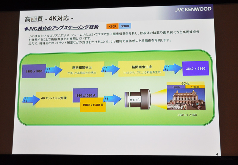 HOME > ニュース > AV&ホームシアターニュース 最上位「X90R」は105万円 【更新】JVC、4K2Kモデル「DLA-X90R」など3D対応D-ILAプロジェクター3機種を11月下旬に発売 ファイル・ウェブ編集部 2011年10月12日 前の写真へ 次の写真へ 4Kアップスケーリング技術の解説 前の写真へ 次の写真へ この写真の記事へ 関連リンク JVCケンウッド JVCケンウッドのプロジェクター先行視聴会 JVCケンウッドの新製品情報