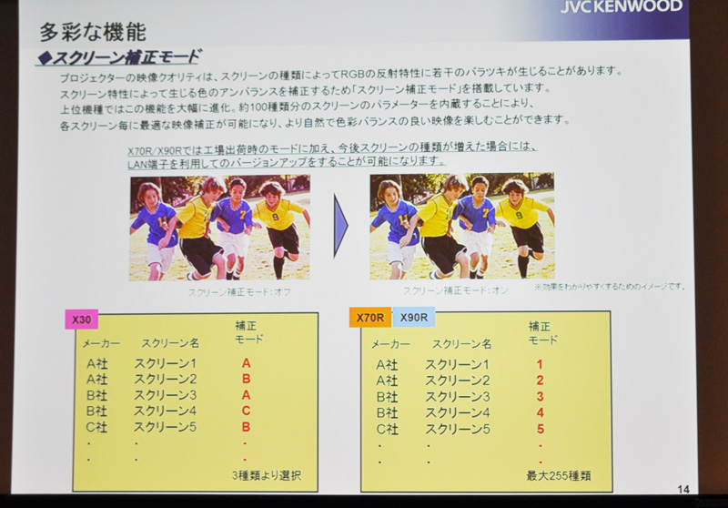 HOME > ニュース > AV&ホームシアターニュース 最上位「X90R」は105万円 【更新】JVC、4K2Kモデル「DLA-X90R」など3D対応D-ILAプロジェクター3機種を11月下旬に発売 ファイル・ウェブ編集部 2011年10月12日 前の写真へ 次の写真へ スクリーン補正モードも強化されている 前の写真へ 次の写真へ この写真の記事へ 関連リンク JVCケンウッド JVCケンウッドのプロジェクター先行視聴会 JVCケンウッドの新製品情報