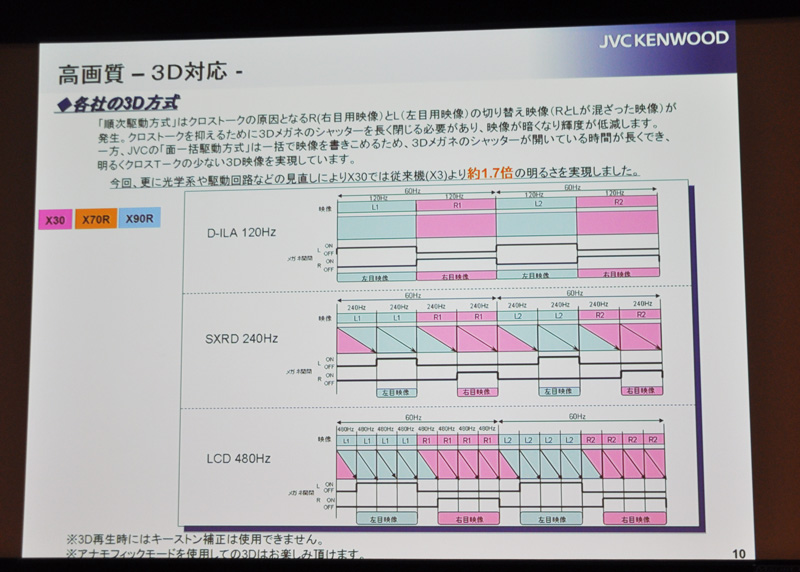 HOME > ニュース > AV&ホームシアターニュース 最上位「X90R」は105万円 【更新】JVC、4K2Kモデル「DLA-X90R」など3D対応D-ILAプロジェクター3機種を11月下旬に発売 ファイル・ウェブ編集部 2011年10月12日 前の写真へ 次の写真へ D-ILA素子のデジタル駆動技術を活かし、明るく高精細な3D表示を実現 前の写真へ 次の写真へ この写真の記事へ 関連リンク JVCケンウッド JVCケンウッドのプロジェクター先行視聴会 JVCケンウッドの新製品情報