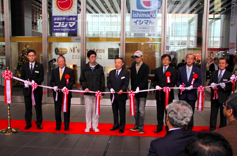 開場前のテープカットの模様。校條会長の両脇は一般参加者