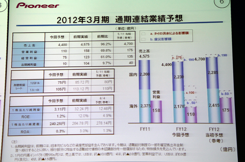 HOME > ニュース > AV&ホームシアターニュース 12年度業績の下方修正も発表 パイオニア、新・中期事業計画を発表 − 医療分野へ参入、他社協業も加速 ファイル・ウェブ編集部 2011年11月30日 前の写真へ 次の写真へ 下方修正された2012年度連結業績予想 前の写真へ 次の写真へ この写真の記事へ 関連リンク 2012年度連結業績予想に関するリリース(PDF) 新・中期事業計画についてのリリース(PDF)