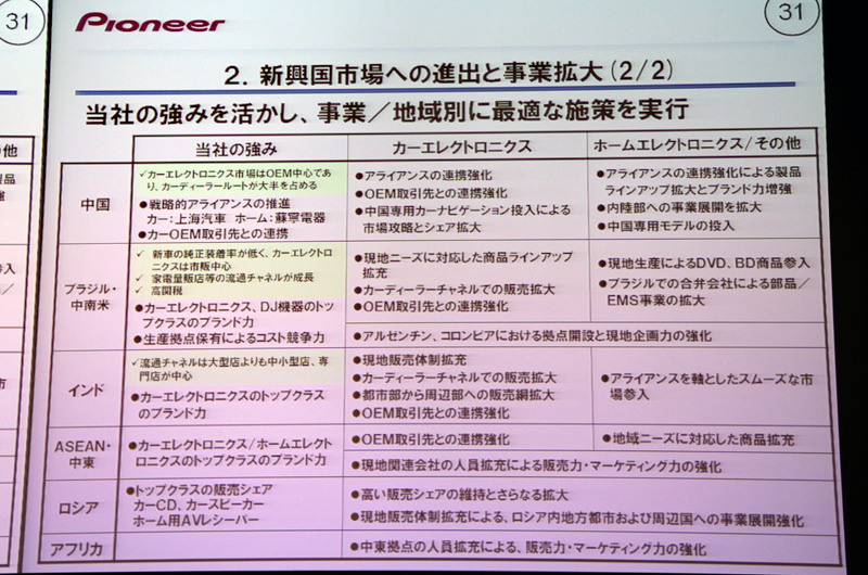 HOME > ニュース > AV&ホームシアターニュース 12年度業績の下方修正も発表 パイオニア、新・中期事業計画を発表 − 医療分野へ参入、他社協業も加速 ファイル・ウェブ編集部 2011年11月30日 前の写真へ 次の写真へ 各地域ごとに戦略を分け、地域ニーズを重視したマーケティング・製品投入を行う 前の写真へ 次の写真へ この写真の記事へ 関連リンク 2012年度連結業績予想に関するリリース(PDF) 新・中期事業計画についてのリリース(PDF)