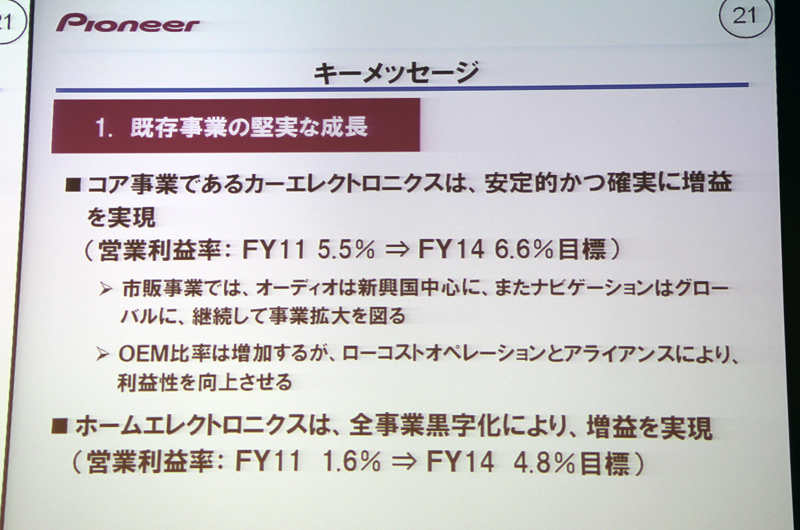 HOME > ニュース > AV&ホームシアターニュース 12年度業績の下方修正も発表 パイオニア、新・中期事業計画を発表 − 医療分野へ参入、他社協業も加速 ファイル・ウェブ編集部 2011年11月30日 前の写真へ 次の写真へ 既存事業の堅実な成長を図る 前の写真へ 次の写真へ この写真の記事へ 関連リンク 2012年度連結業績予想に関するリリース(PDF) 新・中期事業計画についてのリリース(PDF)