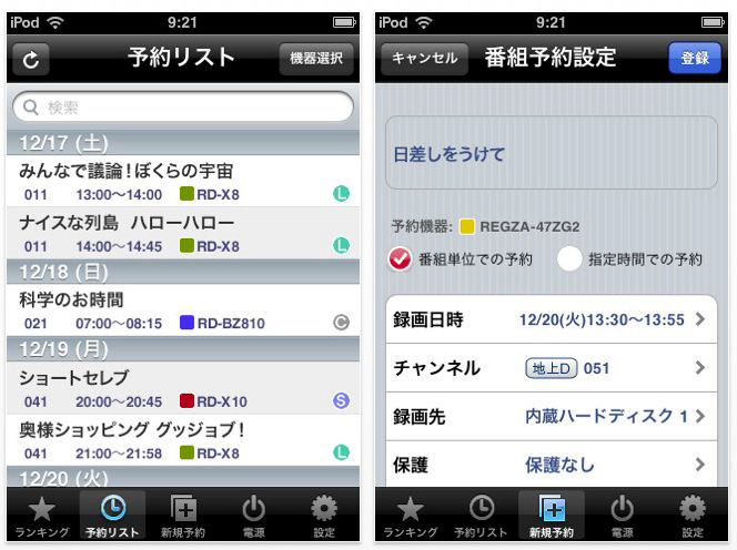HOME > ニュース > AV&ホームシアターニュース メール予約機能も使える 東芝、iOS向けの録画予約コントロールアプリ「RZスケジューラ」を公開 ファイル・ウェブ編集部 2012年01月06日 前の写真へ 登録機器ごとの表示に対応した予約リスト/番組予約の設定 前の写真へ この写真の記事へ 関連リンク 東芝 「RZスケジューラ」の詳しい紹介 App Storeのアプリ紹介ページ