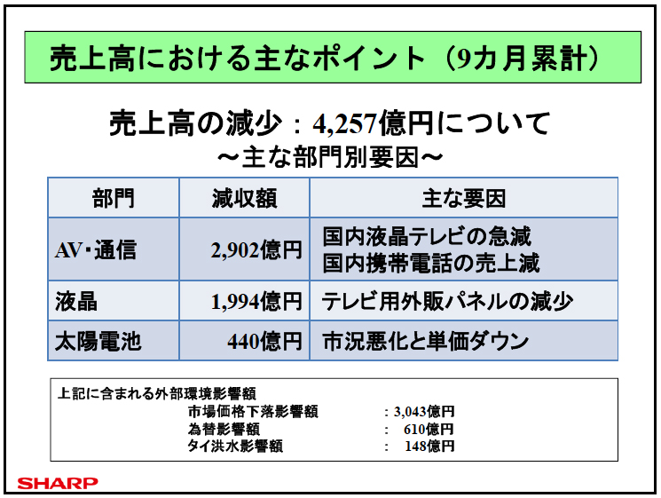 国内液晶テレビ事業の急減などにより売上高が大幅に減少