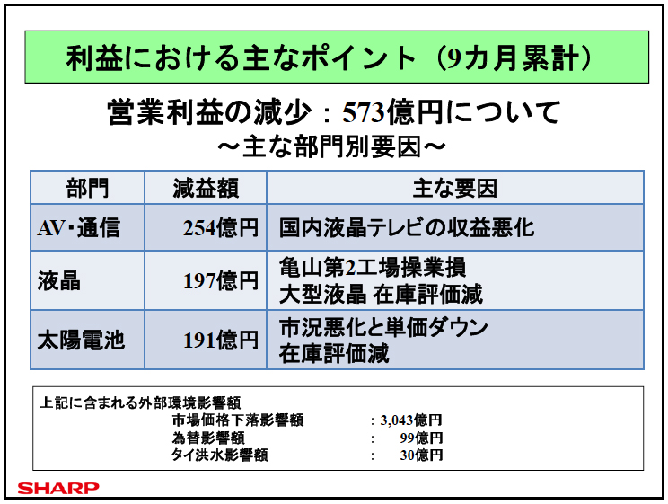 【更新】シャープ、通期業績を約2,900億円の赤字へ下方修正 − 液晶テレビの落ち込み影響大