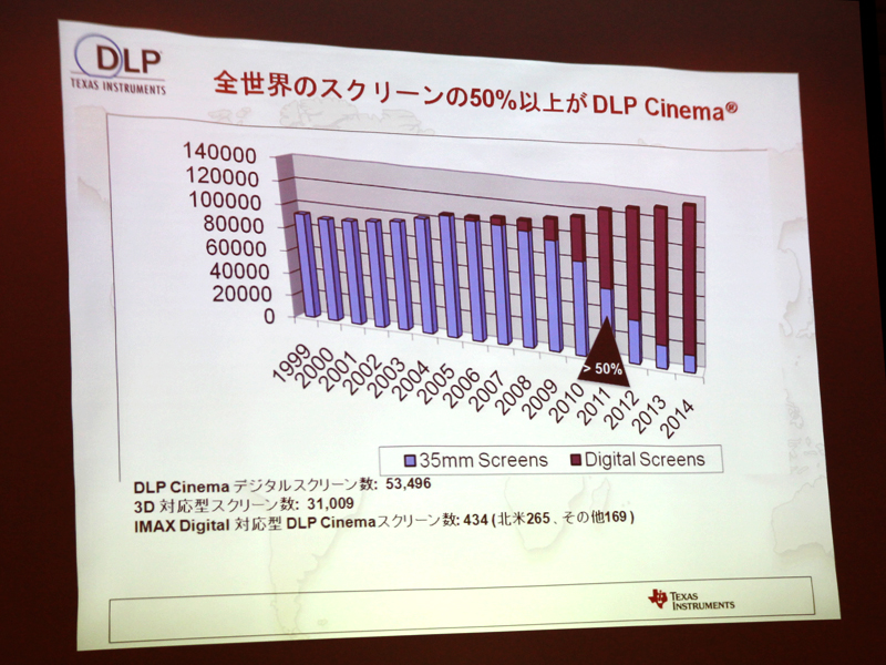 HOME > ニュース > AV&ホームシアターニュース 開発キット「DLP LightCrafter」も発表 TI、DLP技術のマルチデバイス化を加速 − 家庭用4Kチップの展開にも言及 ファイル・ウェブ編集部 2012年02月10日 前の写真へ 全世界のシネマスクリーンの50%以上が、「DLP cinemaテクノロジー」採用のデジシネに移行したと発表 前の写真へ この写真の記事へ 関連リンク テキサス・インスツルメンツ