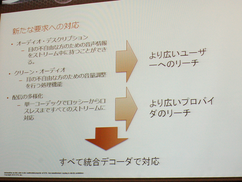 HOME > ニュース > AV&ホームシアターニュース 11.1ch「DTS Neo:X」デモも実施 DTS 、注目のサウンド技術を紹介する「パートナーセミナー」を開催 − 3月2日(金)は大阪で実施 ファイル・ウェブ編集部 2012年02月24日 前の写真へ 次の写真へ 様々なシーンに適応するDTSの各音声ストリームに、単一デコーダーで完結に対応する「統合デコーダー」思想 前の写真へ 次の写真へ この写真の記事へ 関連リンク dts Japan DTS Partner Seminar 2012の詳細 「配信コンテンツ時代」を担う、DTSの最新高音質技術