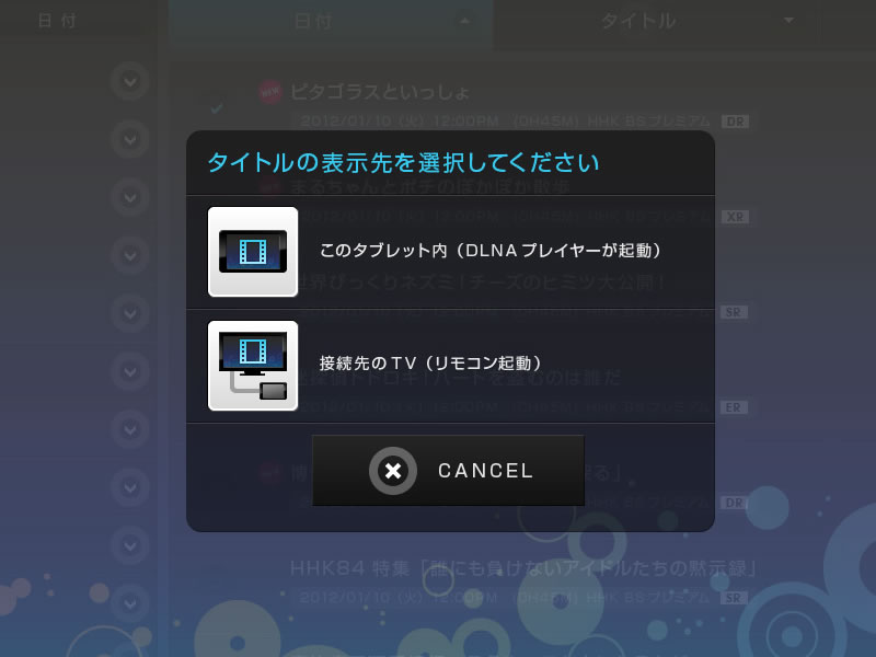 選択した番組をSony Tablet上で見るかテレビで見る(レコーダーのリモコンとしてタブレットを使用する)かを選択
