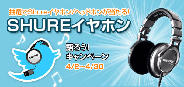 HOME > ニュース > AV&ホームシアターニュース お題が毎週変わる。4月30日まで。 SHURE、つぶやきでイヤホン/ヘッドホンが当たるキャンペーンを開始 ファイル・ウェブ編集部 2012年04月02日 この写真の記事へ 関連リンク キャンペーンの詳細 SHURE JAPAN
