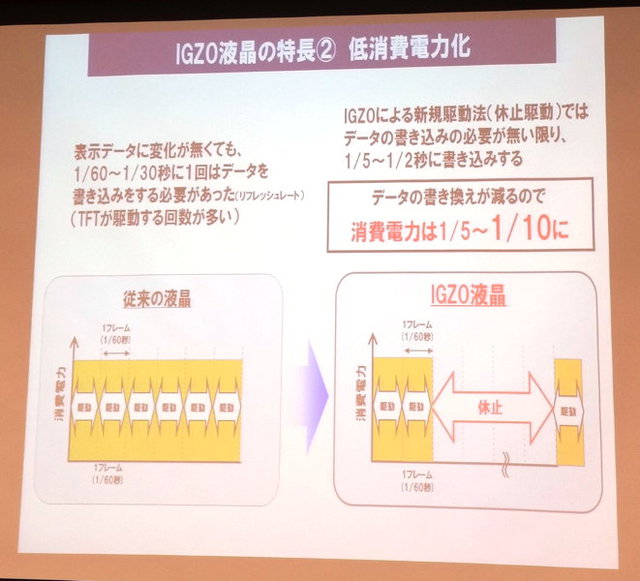 消費電力が低いのもIGZOの特徴で、消費電力は1/5〜1/10に抑えられるという